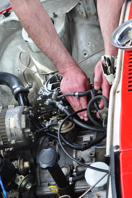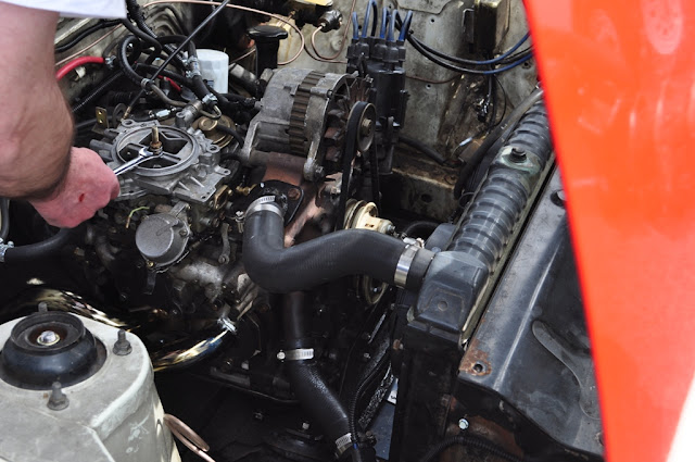 We battled fuel issues for several hours before we finally got it fixed (clogged fuel line, just before the filter). Too bad there are no pics of me buried under the back of the car, I was filthy after that...