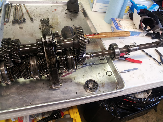 I knew the general area the problem would be found in; it's the same shift rod for both gears so it had to be something with the rod, the detents (ball bearings that keep the shift rods in place when a gear is selected), or the synchros. Carl was over that day and helping me out, so it was a lot easier getting it apart then doing it all yourself.