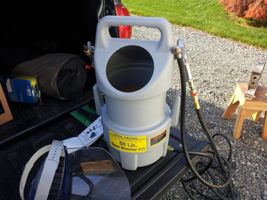 Less than $75 will get you a media blaster and 25# of walnut shell, perfect for blasting just about anything off or out of an engine without harming the metal. Something not to be overlooked when using one of these is eye protection. I would also recommend not wearing shorts, as the ricochets don't feel the best. And don't do this in your garage, or close to it with the door open; this stuff goes everywhere.
